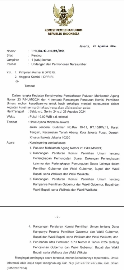 - KPU diinstruksikan penguasa (?) memakai keputusan MA (Keluar surat Meeting dengan DPR, lihat lampiran), dan tidak perlu sahkan RUU Pilkada. Tinggal nunggu tanggal 27 Agustus saja KPU bisa melaksanakan kerja sesuai putusan MA. -Kalau mau (sesuai) Keputusan MK dilaksanakan KPU harus membuat perubahan peraturan kpu sesuai dgn putusan MK. Kalau ini benar, artinya mereka (KPU) akan bahas putusan MA untuk kemudian dijadikan PKPU. Bukan putusan MK. -Mereka akan tetap paksa loloskan Kaesang.