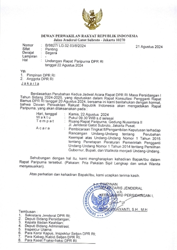 - DPR tunda Rapat Paripurna RUU Pilkada, Dasco mengatakan rapat paripurna ditunda karena jumlah peserta rapat yang hadir tidak memenuhi tata tertib yang berlaku sehingga tidak kuorum.