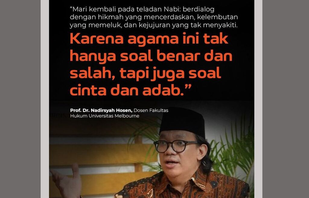 "Mari kembali pada teladan Nabi: berdialog dengan hikmah yang mencerdaskan, kelembutan yang memeluk, dan kejujuran yang tak menyakiti. Karena agama ini tak hanya soal benar dan salah, tapi juga soal cinta dan adab." Prof. Dr. Nadirsyah Hosen, Dosen Fakultas Hukum Universitas Melbourne.