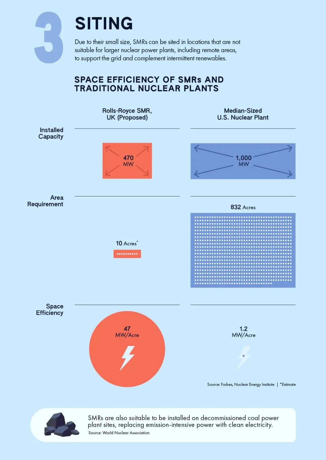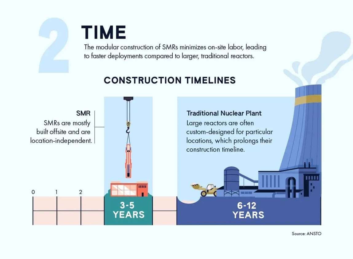 Banyak keunggulan SMR yang secara intrinsik terkait dengan konstruksinya yang ringkas dan modular. SMR dapat ditempatkan di area yang tidak cocok untuk reaktor tenaga nuklir yang lebih besar karena tapaknya yang lebih kecil. Dibandingkan dengan reaktor daya besar, yang sering kali dirancang khusus untuk lokasi tertentu dan kadang-kadang dapat menyebabkan penundaan konstruksi, SMR lebih ekonomis untuk dikembangkan karena modul prefabrikasi dapat dibangun, dikirim, dan dipasang di lokasi. SMR dapat diimplementasikan secara bertahap untuk memenuhi permintaan energi yang terus meningkat dan memberikan pengurangan biaya dan waktu konstruksi.