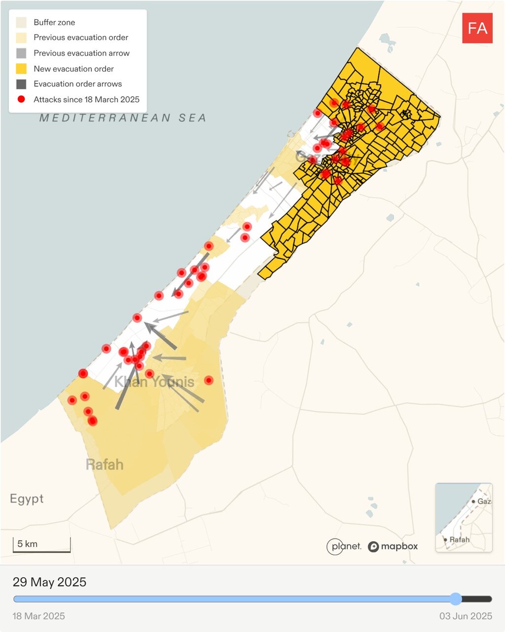 Peta ini memvisualisasikan seluruh 34 perintah evakuasi yang dikeluarkan oleh militer Israel ke daerah-daerah di Gaza sejak pembubaran gencatan senjata pada tanggal 18 Maret 2025, hingga 3 Juni 2025.