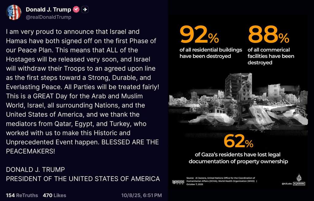 “Saya sangat bangga mengumumkan bahwa Israel dan Hamas telah menandatangani Tahap pertama Rencana Perdamaian kami. Ini berarti SEMUA Sandera akan segera dibebaskan, dan Israel akan menarik pasukan mereka ke garis yang disepakati sebagai langkah pertama menuju Perdamaian yang Kuat, Bertahan Lama, dan Abadi. Semua Pihak akan diperlakukan secara adil!