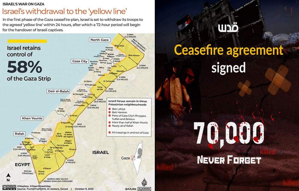 Israel telah mulai menarik pasukannya dari Gaza ke “garis kuning,” setelah itu Israel akan mengontrol sekitar 53% wilayah Gaza hingga fase kedua kesepakatan tercapai mengenai pelucutan senjata Hamas, pasukan internasional, dan tata kelola Gaza. Gencatan senjata berlaku, tetapi tidak akan sepenuhnya ditegakkan hingga penarikan pasukan selesai, sehingga warga belum dapat kembali.