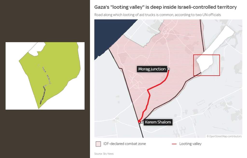 Dalam seminggu menjelang 1 Agustus, 89% truk bantuan PBB yang memasuki Gaza dijarah. Otoritas Israel telah menggunakan tingkat intersepsi yang tinggi untuk menggambarkan mekanisme pengiriman bantuan PBB sebagai kegagalan — tetapi seorang jurnalis investigasi digital Sky News menemukan bahwa tumpahan tepung yang terlihat "hampir semuanya berada jauh di dalam area yang dinyatakan sebagai zona tempur IDF" — area tempat Yasser Abu Shabab dan milisinya yang didukung Israel diketahui beroperasi. Drop Site @DropSiteNews - 12 Agt 2025. Area pink zona = IDF combat zone (Rafah), map hijau, dan titik2 cecerah tepung.