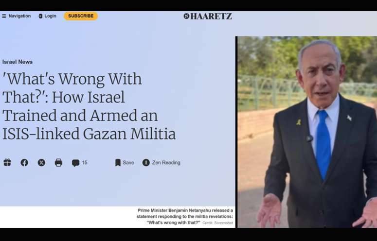 Netanyahu, secara rahasia menyetujui melatih dan mempersenjatai milisi Palestina di Gaza yang terkait dengan ISIS (Islamic State). Yasser Abu Shabab dari klan Bedouin Hamashah, didukung untuk menjaga truk bantuan kemanusiaan di selatan Gaza (GHF). Artikel diterbitkan pada 11 Juni 2025.