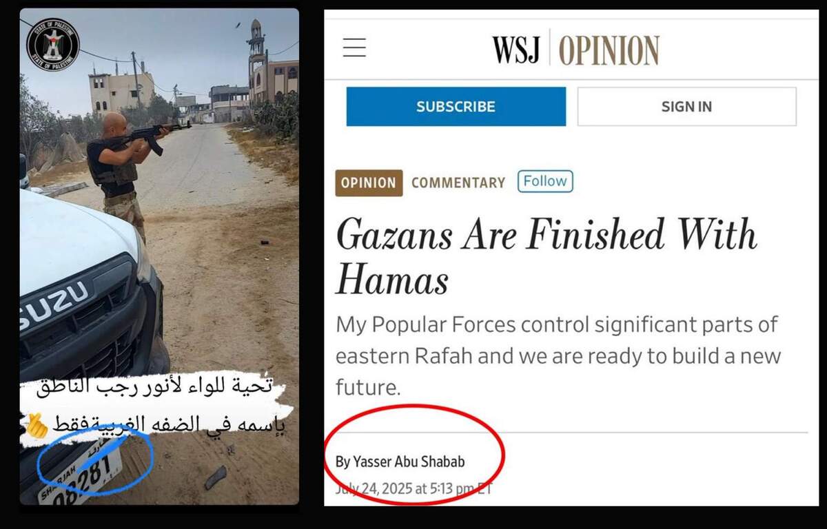 Kanan: Betapa besarnya kemunduran yang dialami oleh mesin media Amerika. Pemimpin geng yang didukung Israel dan terkait ISIS kini menulis artikel opini untuk WSJ (The Wall Street Journal), Menggelikan, padahal tidak bisa baca tulis, dan tidak sekolah pen.. Yasser Abu Shabab dituduh memimpin penjarahan sistematis bantuan kemanusiaan, termasuk pencurian 98 truk PBB di dekat Kerem Shalom pada November 2024. Kelompoknya beroperasi di timur Rafah di bawah perlindungan Israel, memeras dan menyerang konvoi bantuan, serta menerima senjata yang diduga berasal dari pasukan Israel, menurut Washington Post dan The Guardian. Ini adalah masa-masa tergelap dalam sejarah media. Khalissee @Kahlissee - 26 Juli 2025