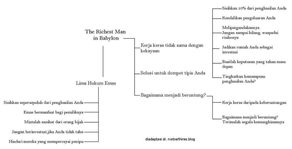 Cerita yang ditulis George S. Clason (pertama kali terbit 1926) menerbitkan serangkaian perumpamaan berlatar kota kuno Babilonia, yang kemudian menjadi literatur keuangan klasik. Edisi buku ini diperbarui dalam bahasa Inggris modern. Buku berkisah tentang kerja keras, tabungan, bunga majemuk, dan rahasia “dompet gemuk”. The Richest Man in Babylon adalah panduan kesadaran finansial. Sebenarnya ini bukan buku cara cepat menjadi kaya.